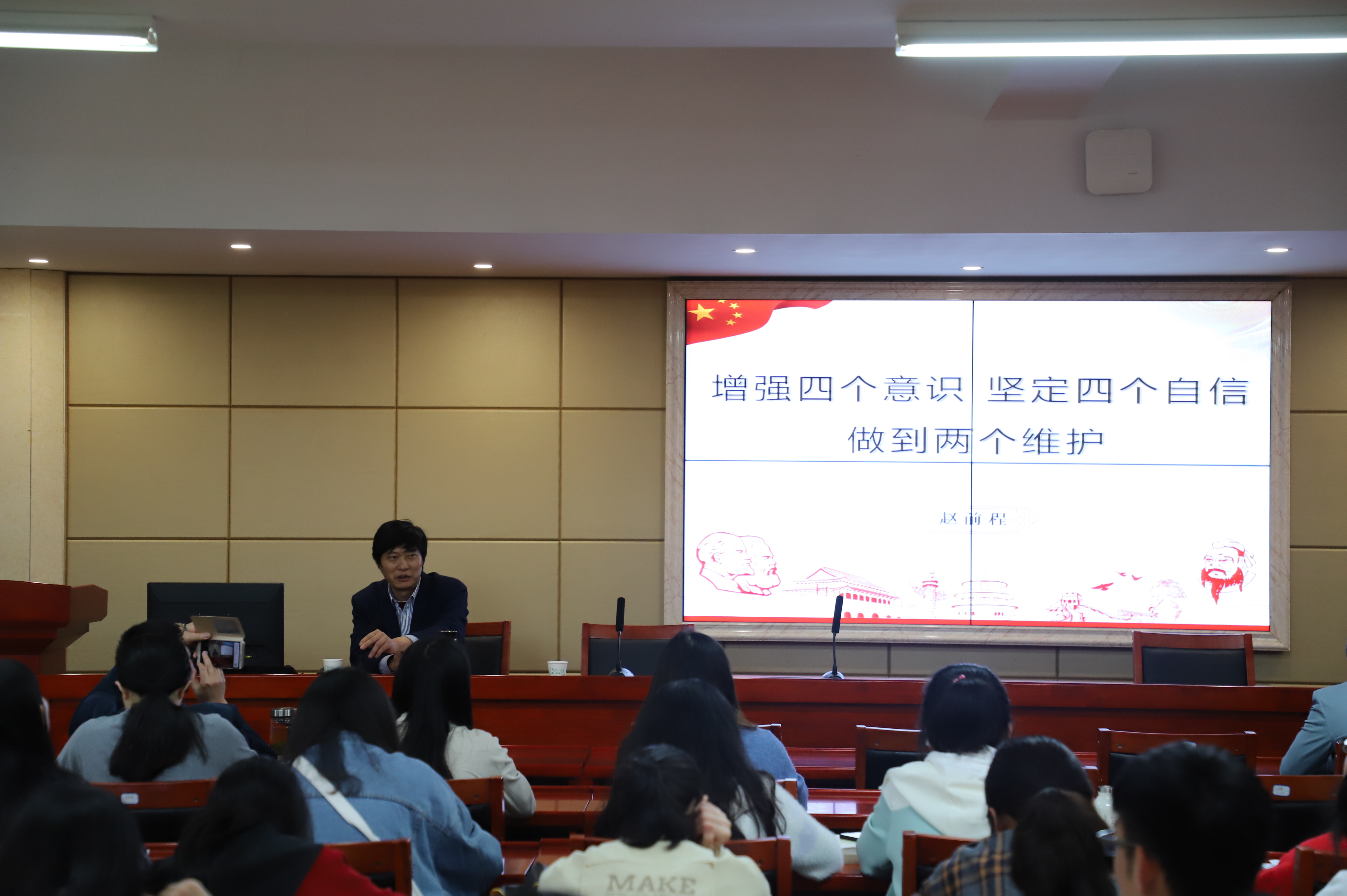 应公司党委邀请,公司党委委员、统战部长赵前程教授于4月16日下午在立言楼4-1报告厅为公司教工第五支部的党员老师和员工入党积极分子讲了一堂主题为“增强四个意识、坚定四个自信、做到两个维护”的精彩党课。