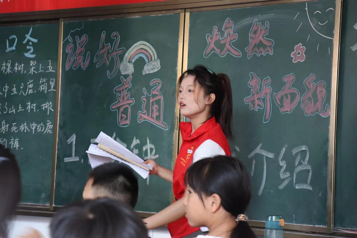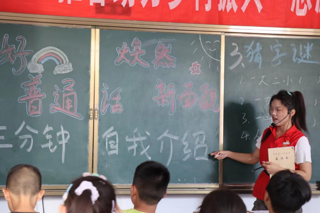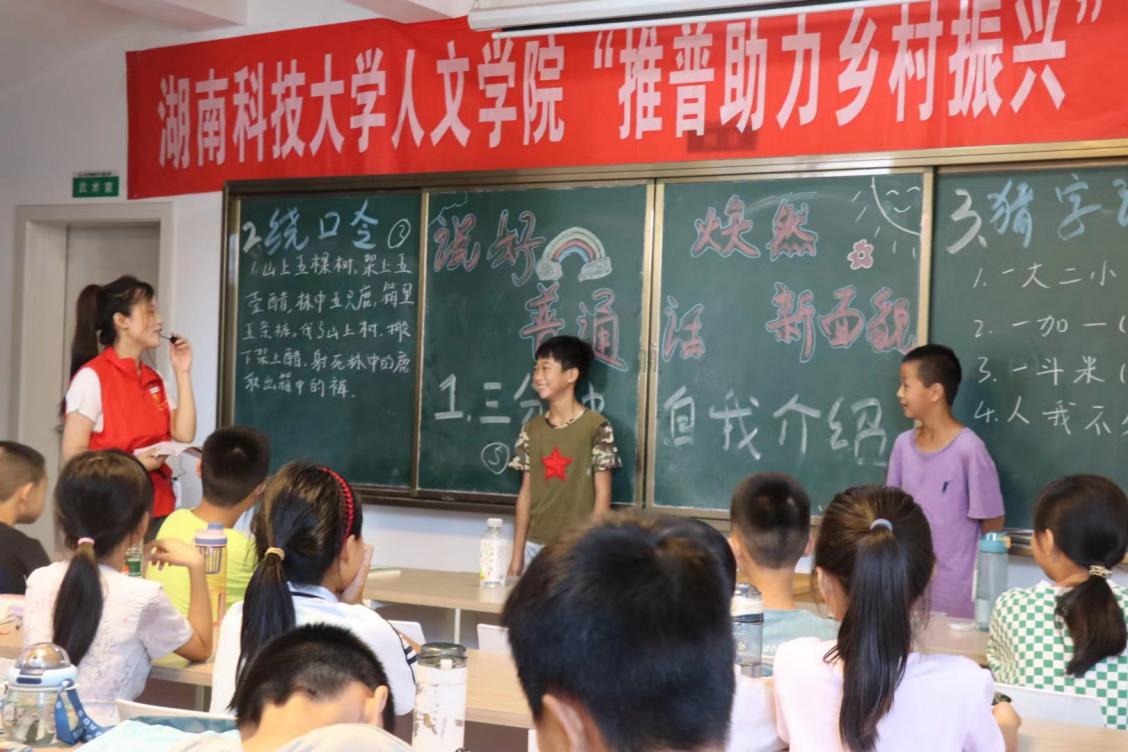7月9日上午,株洲攸县石羊塘镇儿童之家传来了一阵又一阵的鼓掌声,四年级孩子们的欢笑声此起彼伏地传来。走进教室一看,是志愿者龙杨慧在教孩子们读绕口令。“发扬国风,从说中国话起;说中国话,从普通话开始。”为了圆满完成推普助力乡村振兴的志愿服务目标,在乡村大力推广普通话,传承优秀传统文化,为此3044永利集团“三下乡”实践团队在暑期公司展开三下乡特别课堂第三期:说好普通话,焕然新面貌。
