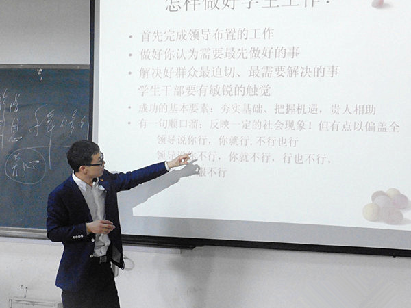 一个多小时的演讲后,提问环节将整场讲座气氛掀到最高潮。“您是怎样将自信和帅气变为一种生活常态呢?”12级历史二班的程俊一提出他的疑问,现场爆笑,掌声连连,尹书记风趣爽朗地回答:“首先是要穿着帅,我穿的就是韩版的外套和衬衫。除此之外,很重要的就是人格魅力,我们要用品格去感染和引导别人!”