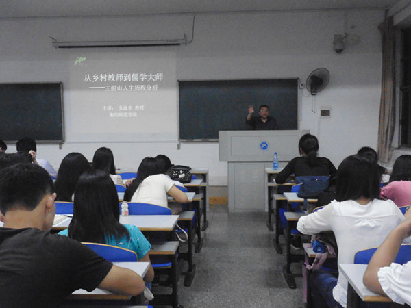 为了让同学们更加了解王夫之这一哲学家,朱教授首先放映了电视专题片《不灭的圣灯》,介绍了关于王船山的三个传说,深度解剖了他忠诚、高洁、有远见的性格特征。朱教授根据当代中国人的思想现状,反证王夫之不随波逐流的精神可贵之处。他认为,王夫之的朴实唯物主义和辩证法是中国哲学体系中的宝贵财富,而这一哲学思想也贯穿了船山先生的一生。