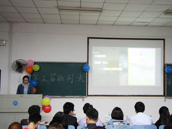 “好看的皮囊千篇一律,有趣的灵魂万里挑一。”广告二班班刊《ADIO》讲解人以这句话开场,展现广告人追求创新与不落窠臼的风格。班刊中包含广告“创意赏析”、“怪梦奇谭”、“灵感瞬间”、“新审美观”等板块。“不做总统,就做广告人。”广告一班《创异者》讲解人引用美国罗斯福总统的话自信开场,赢得观众的掌声。广告一班班刊以“异”字为中心,分为“纳奇录异”、“异彩纷呈”、“标新立异”、“异想天开”等部分,展示广告一班员工的专业素养与“创异”精神。在班级视频展示中,视频精美的制作令观众拍手叫好。新闻二班的班刊既真实体现出了新闻班的风貌和特色,又体现出新闻人对社会的关注与人文关怀。他们的班刊以《聚焦》为名,分为“余论”、“文囿”、“视野”、“印象”、“聊斋”等板块,版式新颖,内容丰富。讲解员清晰认真的讲解更是为比赛增了不少印象分。