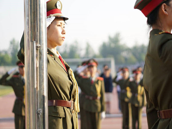 16名同学紧张的训练一周,同甘共苦只为让国旗缓缓上升、迎风飘扬。这一周里,他们早起早训、升旗前几日的特训、合训以及紧急集合训练。16文学专业的肖倩同学是一名“护旗手”,看着国旗缓缓升起,她的激动溢于言表:“站在旗台前,看着红旗冉冉升起,敬礼的手都在颤抖,雄雄国歌,震撼人心。那一刻,对国家充满着无限的敬畏。”
