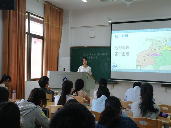 “元丰六年十月十二日夜,解衣欲睡,月色入户……”伴随着悠悠音乐响起,14级文学专业的王易新用舒缓的语调朗读了《记承天寺夜游》,她通过与李白的《古朗月行》作比较,从新的角度解读此文。而14级历史专业的易秋艳以秦朝中央集权制度的形成为课题,向我们展示了从诸侯争霸到秦统一的历史画卷,并细致分析了秦朝如何巩固统一。“社会经济、民心、变法、秦王的雄才大略等,这些都促使了秦朝的统一。”15级思想政治专业的孙闻博则将知识与实际相结合,激昂自信地告诉观众:哲学并不是高高悬浮于空中的思想楼阁,而是源于生活。随着讲课的深入,层层的剖析,观众的思维也跟着说课的内容拓展,抛出的课堂问题更是引发了观众的兴趣。