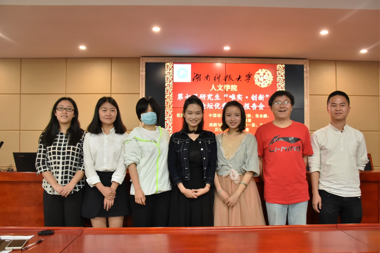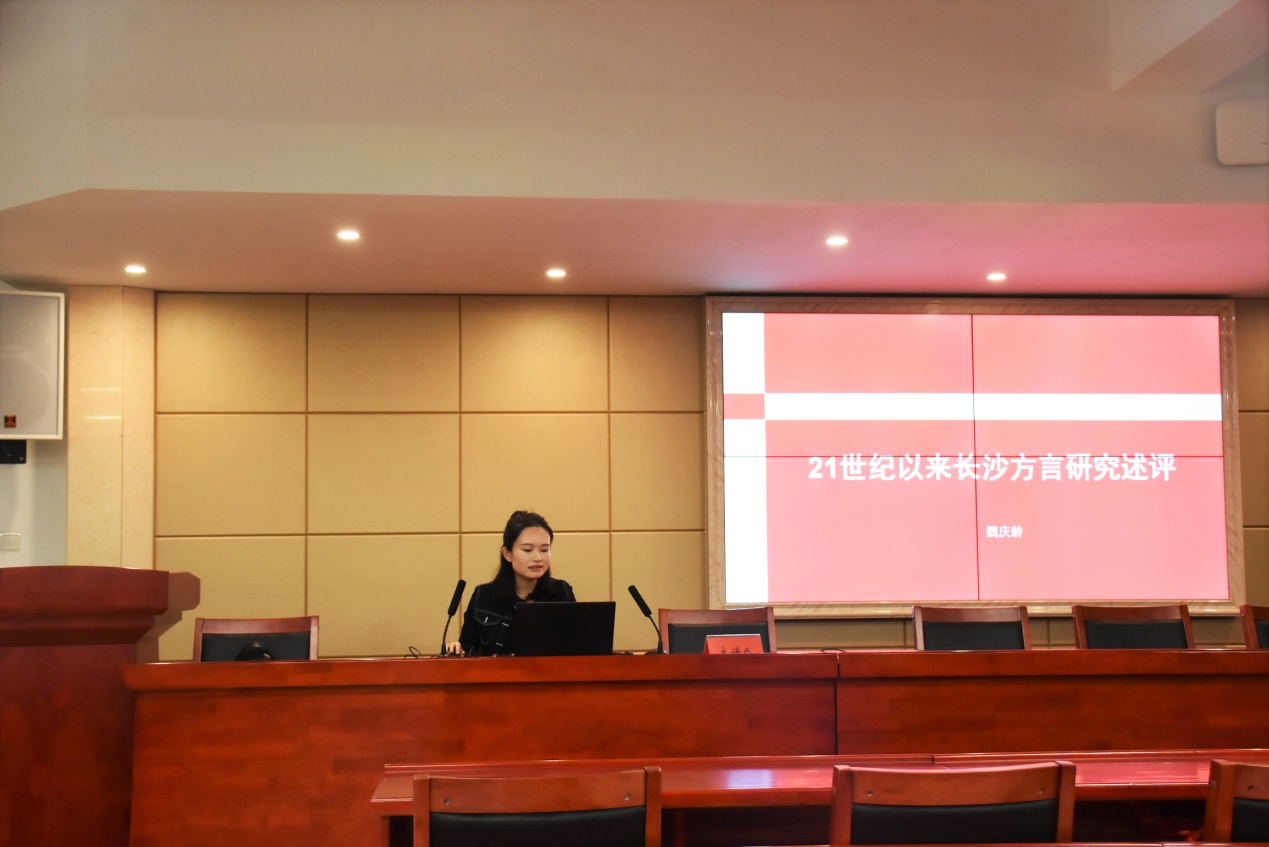 报告会全程采用ppt展示的方式,由公司成功入选校优秀论文一等奖的六位报告人作论文简述。魏庆龄从语音的历史演变特点,长沙方言语法、词法、句法等方面进行论文讲解,提出其论文是以21世纪以来长沙方言研究为重点。张永娜简述了她分步骤完成论文的写作过程,从“狭义修辞学”、“广义修辞学”对汉语修辞进行了界定。而黄楚倩则从《纪实与虚构》这篇小说中窥探出王安忆小说的“不要特殊环境特殊人物,不要太多材料,不要语言风格化,不要独特性”这“四不要”规则。