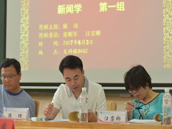 答辩以员工上台论述论文的选题原因、研究方法、论文内容及其不足之处,场下导师进行指导的方式进行。新闻系的黄茂春的论文《大数据和数据新闻的管理比较》分别从数据新闻以及如何克服数据新闻的虚假性等方面进行分析,详细阐述了当前数据新闻的现状,并从微博等各种数据源分析数据的可靠性,获得张学知老师较好的评价。