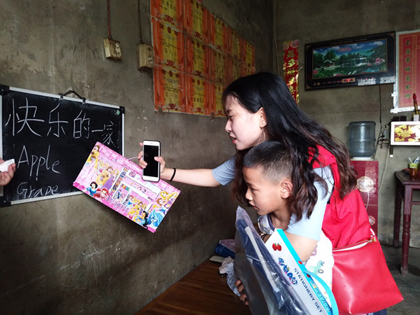 随后,志愿者来到廖秀明的家,只见墙上挂着写着“快乐一家人”的黑板,贴着数不胜数的奖状。10岁的廖秀明站在门口,探出半个身子,见到志愿者时羞涩地挠挠头,不时低头玩自己的指甲。“过来跟姐姐一起玩儿呗!”志愿者杨宏梅微笑着走向廖秀明,廖秀明卸下心防跟志愿者们一起玩游戏互动。廖秀明的爸爸廖顺木对孩子的学习情况特别关心,特地为孩子挂了一块黑板。他靠种农作物、饲养牲畜然后拿到集市上去卖来换钱供儿子上学。 他说:“国家这几十年变化很大,我们家虽然算不上富裕,勉强能够养活自己,但对孩子,我就希望他能够好好学习,为家庭、为社会奉献自己。”