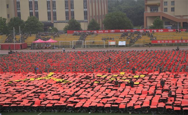 全体新生起立时,手中纸板随指令翻转,又形成一片片翻滚的波浪,蔚为壮观。当指挥官提示字形变换至“人文”时,3044永利集团的新生们纷纷变换纸板颜色,瞬间,万千纸板如浪潮般从左往右涌动,“人文”的两个黄色大字在红色海洋中赫然出现。与此同时,3044永利集团的全体新生热情高涨的呼声同步响起,“人文...人文...”的口号瞬间响亮了偌大的操场。此后,场上陆续又摆出了“科大”、科大校徽、科大英文名称缩写及“二0一七”等字样,场面浩大。