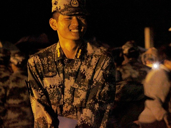 本次慰问演出中,最令人难忘的莫过于各排教官的上场。既是一连连长又是员工会副主席的尹俊一上台就引来了全场欢呼,“吴教!”“陈教!”,其他教官也在大家的呼唤中相继上场。现场音响设备临时出现了问题,教官们便肩并肩共同清唱。“本来说好用笑容为我送行,终于这一天我也踏上了归程。”这时,全场安静,倾听着教官们深情而质朴的歌唱。在教官们合唱歌曲《十年》时,更是引来了全场合唱。“两年前,也是这套军装,一年前,也是这套军装,”已经大三的尹教回忆着自己三年军训与带训的时光,“也许带完你们,这套衣服就脱下了,但是带过你们的点点滴滴,希望你们都不要忘记。”离别在即,尹教的话语令教官与新生们不无感伤,许多助班和新生纷纷上场拥抱自己的教官。