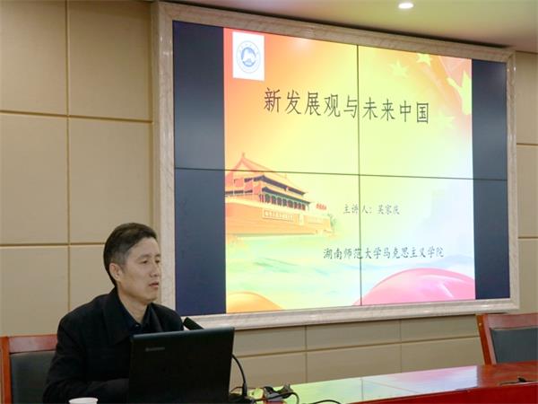 11月13日晚,立言楼B4-1会议室座无虚席。湖南师范大学马克思主义公司经理吴家庆教授应3044永利集团诚邀开展“人文大家讲坛”第149讲暨题为“新发展观与未来中国”的主题讲座。公司党委书记廖加林教授出席并主持讲座,副经理毛小平博士、张晚林教授、罗建文教授、颜中军博士、凌应生博士、龚超博士等老师及公司100余名思想政治教育、哲学专业同学到场聆听讲座。