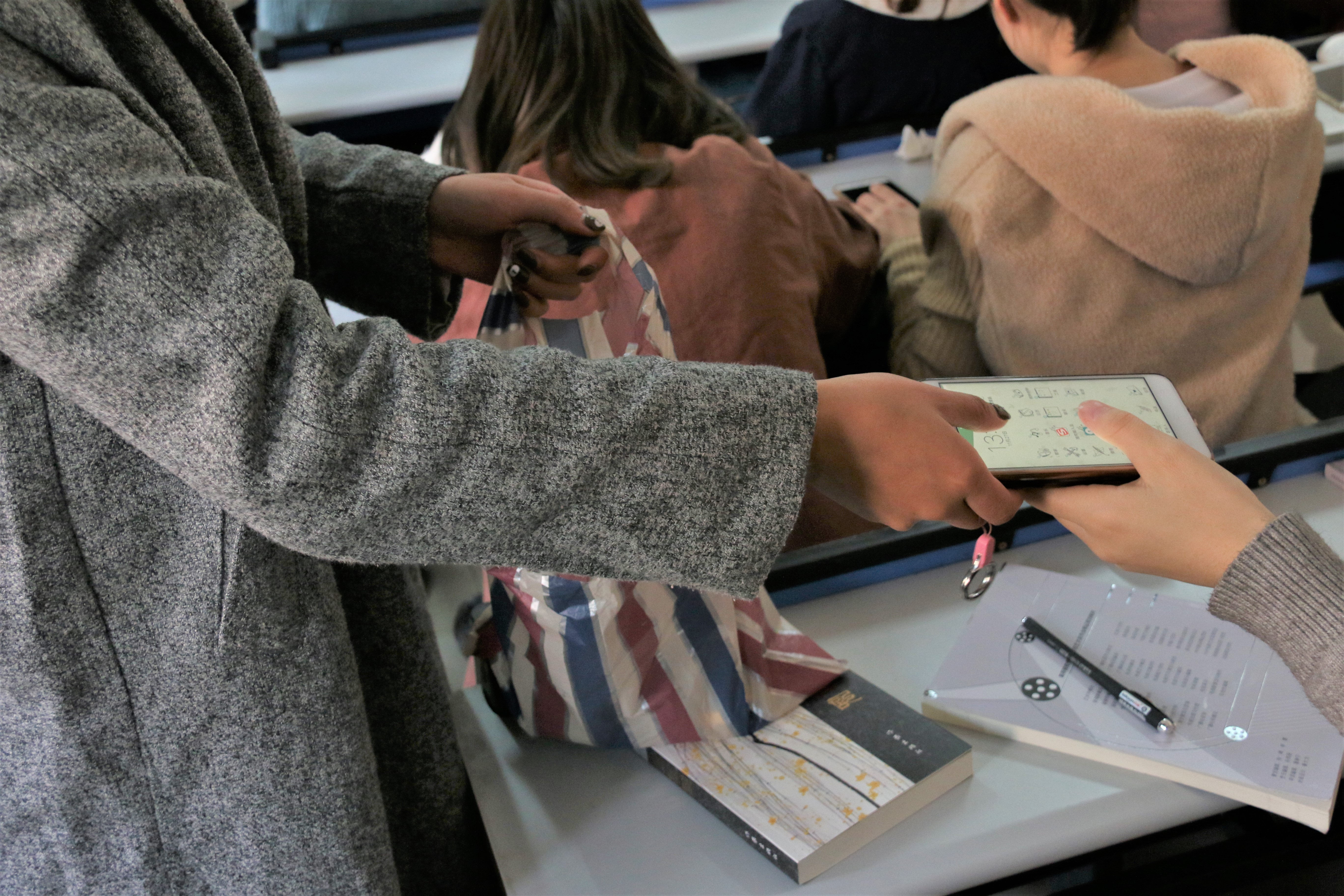 距上课还有15分钟,17级汉语言文学五班的同学们就已到达教室,主动将手机放入收纳袋中,然后回到座位上拿出课本,授课老师也早已到达教室,为上课做着准备。上课铃声准时响起,老师一边生动有趣地讲解,一边在黑板上工整地板书。同学们被精彩的内容深深吸引,瞪大了眼睛望向黑板,时而手撑下巴蹙眉思考,时而低头握笔快速记录。课堂上师生们积极互动,每当老师抛出问题时,同学们都耐心思考,然后踊跃发表自己独到的见解;遇到重难点时,同学们也会马上向老师提出疑问。随机听课的专家们坐在教室最后一排,或观察员工的听课状况,点头应和老师所讲授的内容,或埋头整理考察记录。两节课下来,同学们纷纷表示,老师讲的知识点让人受益匪浅,远离“低头一族”让他们感受到课堂的魅力。