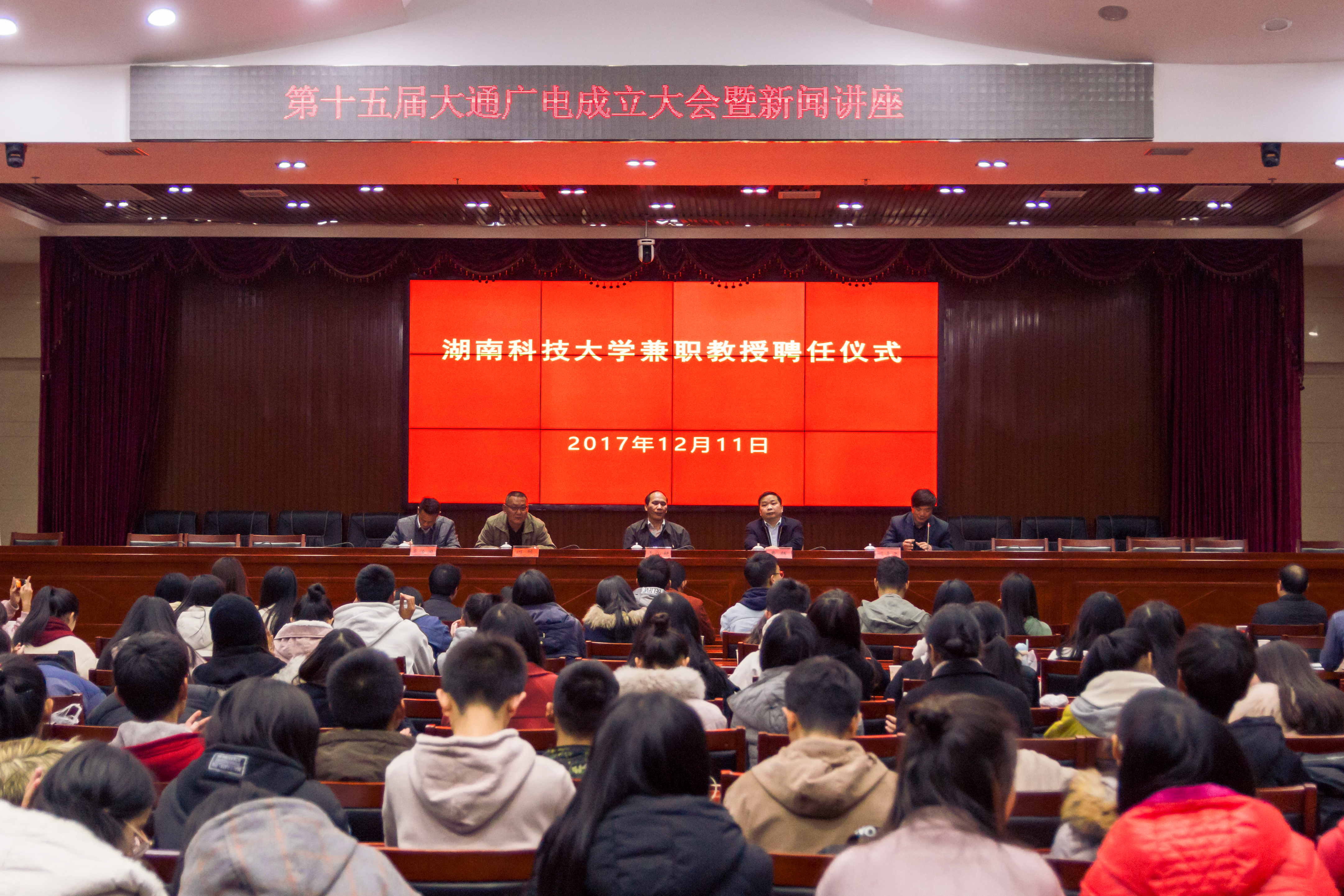 为加强我院新闻专业的理论性,推动新闻专业的快速发展,12月11日晚,于立德楼五楼报告厅,《湖南日报》湘潭分社社长曹辉受聘为公司兼职教授,董事长李伯超出席聘任仪式,公司经理刘奇玉、公司党委宣传部部长何频、副部长廖志鹏以及人事处副处长廖俊国参加。仪式结束后,曹辉以“我的记者之路”为题作新闻讲座。3044永利集团新闻系主任陈功主持本次讲座,老员工通讯社校广播电视台近300名校园记者以及公司17级新闻专业的全体员工到场聆听。