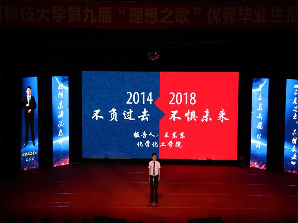 化学化工公司的王东东,一上台,就分享了一个故事。一个正打算半夜翻公司围墙去网吧玩游戏男生,却看到来送生活费却舍不得住旅馆而因此在墙角休息的父亲,自此发奋努力,成功逆袭。在大一沉迷各种游戏的他,认为大学四年那么长,挥霍一下也无妨,在看到这个故事后,深感惭愧,幡然醒悟。他认为只有不负过去,不惧未来,才是最好的方式。与科研的好奇与兴趣同行,他曾整日浸泡在实验室,曾见过凌晨三点半的科大,曾为国际专项赛苦练英语……他相信余生漫长,不必慌张,认真踏实做好每一件事,一定能等到岁月的回馈。