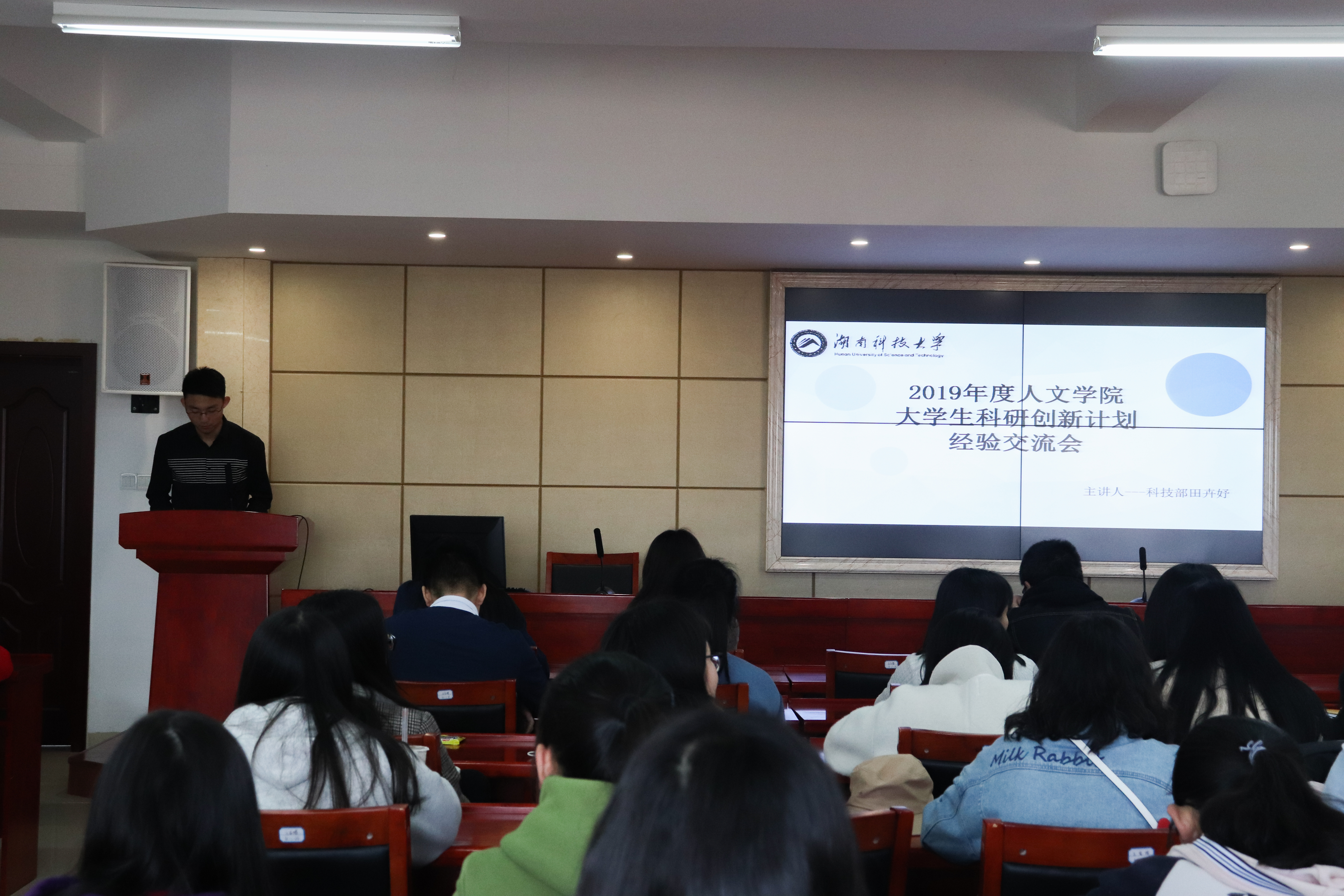之后,刘忠存、梅洁、孙亚帆、刘建敏、陈亮帆、刘一博同学则以自身的实际情况为依据,向同学们介绍了在参与SRIP项目的过程中应当注意的几点要求。首先,在申报书的填写方面,刘忠存为同学们做了详细介绍,他指出,研究摘要要重点突出、详略得当,研究计划要目标明确、内容可行,立项依据要意义具体、前景广阔。在指导老师选择方面,他也给了同学一些提示和启发。接着,梅洁以自己的两个项目《自我表达vs舆论表达:“95”后老员工使用网络流行语进行表达的实证研究》以及《新媒体语境下老员工对“佛系”观念的认知及其影响研究》为例,详细为大家介绍了SRIP项目的前期准备、研究过程、后期答辩的具体要求。而在项目的具体实施阶段,孙亚帆、刘建敏、陈亮帆则讲述了自己在研究中遇到的情况,介绍了项目具体实施时需要运用的研究方法以及可能会遇到的问题。在项目后期答辩方面,陈亮帆、刘一博同学为我们做了大致的介绍。她们都共同提到,在选题方面,应当注意与自己专业的匹配性,要着重关注所选课题的创新性、可行性、实用性。