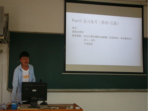 其中,14级外国语公司汉语言国际教育2班徐丰今年成功考上中山大学汉语国际教育专硕,她以自己为例,告诉大家怎么选择公司——结合自身兴趣导向和未来发展,并要评估自身实力。在谈及考研过程中如何进行英语复习时,她提出作文不要只看模板,自己应该学会整合,做笔记时,最好用A4纸,以方便随时补充知识点;而成功考入四川大学汉语国际教育专硕的蒋强在分享自己的经验时,对于英语复习则有自己不同的观点。他说:“我与之前的同学有所不同,我认为英语学习过程中,作文看模板是很重要的,但是不要只是看一个模板,要分不同的类别,对比学习。”蒋强接着为大家推荐了谭剑波、何凯文的相关英语考研书籍。同时他也为大家推荐了曾常年版的《现代汉语练习题》的专业课复习资料,并告诉大家曹老师的课对突破专业课很有帮助,可以有效地检验自身水平以及进行答题思路训练。