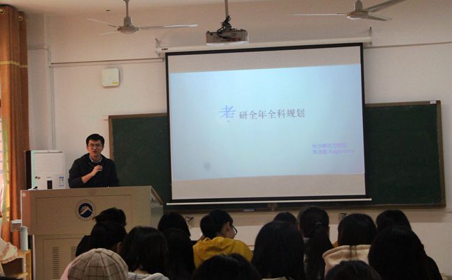 讲座伊始,朱法垚就以风趣幽默的语言做了一个简短的自我介绍,在拉近与同学们关系的同时,也分享了自己考研的经历,给同学们留下了一个关于考研的大致映象。“考研是长线斗争,要抱好做长久战的准备。”他用“长久战”向大家说明了考研是一个需要长时间准备的考试。紧接着,他从考研的院校专业、复习方法、备考规划三个方面给同学们介绍了考研的相关内容。