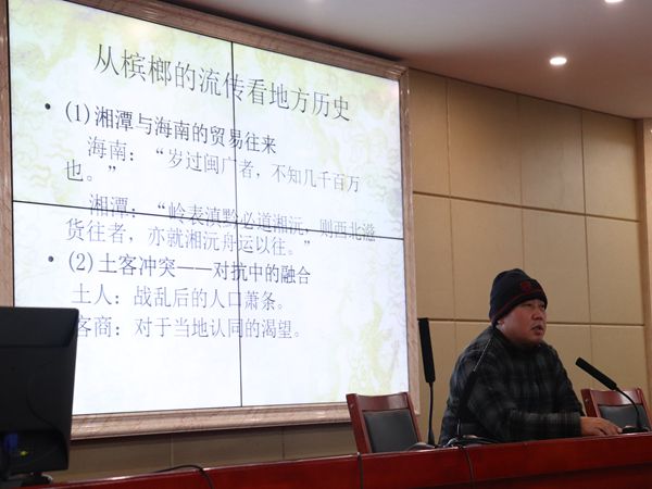 12月9日下午,教育部长江学者特聘教授、中山大学社会学与人类学公司周大鸣教授应邀于立言楼B4-1开展以“湘潭槟榔的传说与际遇”为题的学术讲座。公司李胜清教授担任主持人,廖君湘教授、罗渊教授、潘年英教授、胡铁强副教授、胡志明博士以及文艺学研究生代表和部分18级汉语言文学专业同学到场聆听。