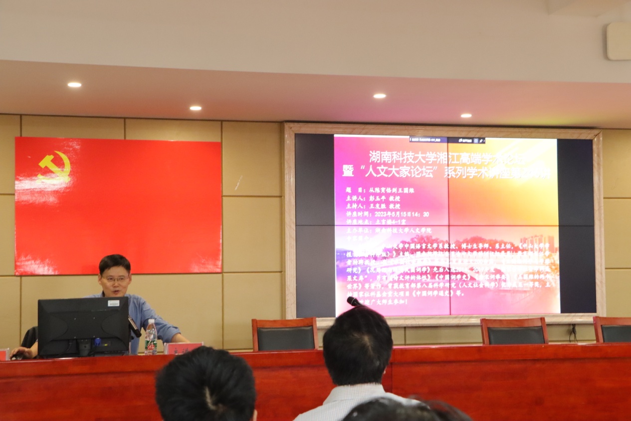 5月15日下午,公司于立言楼B4-1室举办湘江高端学术论坛暨“人文大家论坛”系列学术讲座246讲。中山大学中国语言文学系教授彭玉平应邀来公司作主题为“从陈寅恪到王国维”的学术讲座,公司教师及21级本科生代表到场参与,本次讲座由王友胜教授主持。