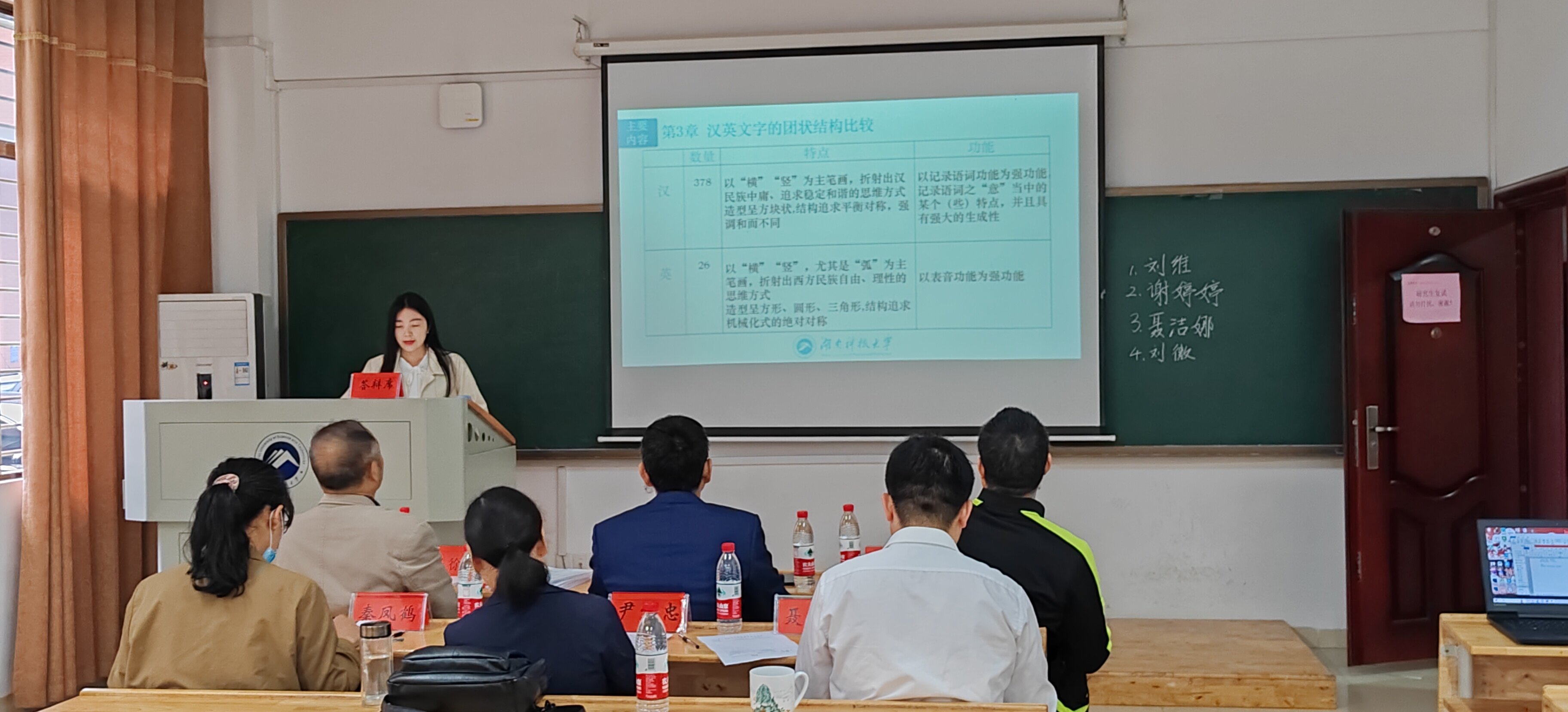 答辩伊始,聂志军教授说明了本次答辩流程,并希望旁听同学仔细聆听、记录笔记。刘维、聂洁娜、谢婷婷和刘微的论文题目分别为《基于视觉文字设计需求的汉英文字比较研究》《<肩水金关汉简(壹-伍)>字词关系研究》《原本<玉篇·山部>校勘整理研究》《<英藏敦煌社会历史文献释录>释文用字类型研究》。四位同学从研究背景、研究内容与结论、研究意义等方面对论文进行阐述,并针对答辩老师的提问分别作出回答。